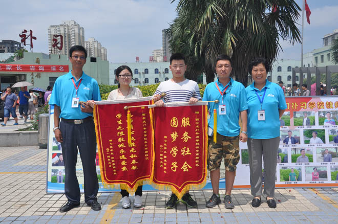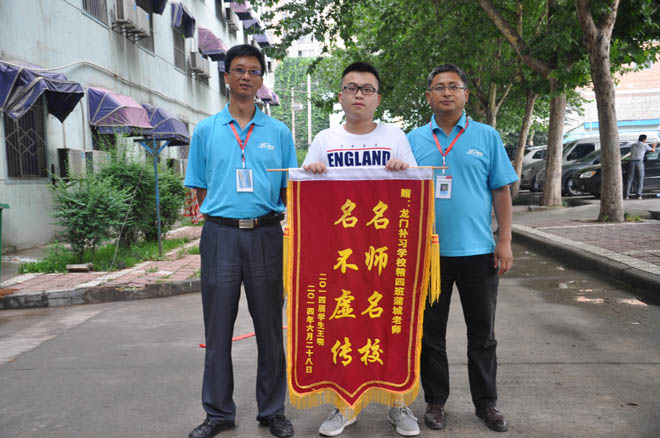 “鞭炮阵阵庆学子圆梦,锦旗飘飘贺龙门辉煌。”6月29日中午,我校李婷、罗堃、薛镇西、徐阳雪等高考学子为母校送来锦旗,感谢母校助他们圆了大学梦。 原学校为长安二中和旬邑中学的文科(应届)五班李婷和罗堃同学,均考出了588分的好成绩。 文科(应届)精品七班的薛镇西同学因在原学校学习不能静下心,导致成绩无法提高,落下了一年半的课程。来龙门上高三后,仅暑期20天预备课程数学练习题他就做完了四个作业本,暑期预备课程结束分班考试后成绩名列前茅,如愿进入重点班。一年学习中,他刻苦努力,勤学苦“练”,最终不但补上了落下的知识,学习成绩有了质的飞跃,更是在高考中考出理想的成绩,他的同班同学徐阳雪也以理想成绩上了陕西二批本科线,他们的成绩比原学校同层次同学高出200分左右。 薛镇西同学说,他的成功不仅是因为来龙门之前有了刻苦学习的决心,更得益于龙门人性化又不乏严格的管理制度,得益于龙门老师渊博的知识、灵活的授课方式和考前对历年高考考点及应试技巧的精确解读,得益于班主任老师一年来严而有爱的管理和引导。在很多外校生看来“地狱式”的龙门生活在他眼中是提高学习成绩的保证,他觉得不苦,因为学有所得,乐在其中。 阵阵鞭炮及学子们手中随风飘扬的锦旗吸引了前来陪考的应届生家长,他们的成功成为我校高质量教学水平及管理水平的有力证明。在此,母校助他们未来的路走的更好,实现自己的梦想。