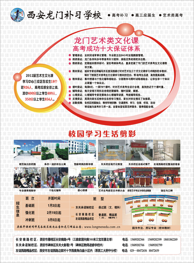 一、学校简介 龙门教育所属西安龙门补习学校是经西安市教育局批准成立的全日制专业中、高考补习学校,现已发展为高补长安南路校区、东关承诺制校区、龙门艺术类高考培训中心、艺术类高考文化课学习中心、高三应届生学习中心、中补精品部、复读部和应届部等机构。2012届在校学生86个班4809名,其中高补52个班3003人,艺术类高考文化课学习中心18个班926人。 龙门艺术生文化课学习中心自2005年开办以来,形成了一套专门针对艺术生短期快速提高成绩的教学方案,并根据多年教学经验编写了专门针对艺术生的校本教材,在2012届学生教学实践中取得了良好的效果,艺术生高考全部上线,其中400分以上学生489人,350分以上学生856人,是陕西省开办最早、成绩最优、环境最好的艺术生文化课学习中心。 二、艺术生文化课开班时间及班型 长安南路校区:1月3日,1月15日,2月19日,3月5日;招收文、理科精品班、普通班。 东关承诺制校区:1月20日,2月20日;招收文、理科保过班。 三、入学准备 1、学校准备:床位、柜子、复读用的有关资料。 2、学生自备:行李(被褥、床上用品等)、衣服、鞋、洗漱用具、餐具、伙食费、锁、暖水瓶、高中各科教材、工具书、学习用品等。 四、学生入学有关规定 1、学生严禁将手机、MP3、MP4、首饰、电器、贵重物品、管制刀具和其他有安全隐患的物品带入学校。 2、学生入学严禁烫发、染发、着装要朴素大方,符合学生身份。 五、入学报到须知 1、报到地点及联系电话: 长安南路校区:西安市雁塔区长安南路4号(三森家居向南500米三宝双喜北邻) 电话:15609202366 15609202399 18681862269 东关承诺制校区:西安市碑林区东关南街大新巷5号(碑林区教师进修学校内) 电话:15609202766 15609202799 2、长安南路校区将于1月2日(周三)报到注册,1月3日正式上课。